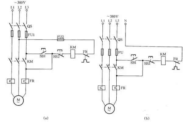 圖中SB2為停止按鈕,在停止時(shí),按動(dòng)SB2的時(shí)間要長(zhǎng)一點(diǎn)。否則,手松開(kāi)按鈕后,接觸器又吸合,使電動(dòng)機(jī)繼續(xù)運(yùn)行。這是因?yàn)殡娫措妷弘m被切斷,但由于慣性的作用,電動(dòng)機(jī)轉(zhuǎn)子仍然轉(zhuǎn)動(dòng),其定子繞組會(huì)產(chǎn)生感應(yīng)電動(dòng)勢(shì),一旦停止按鈕很快復(fù)位,感應(yīng)電動(dòng)勢(shì)直接加在接觸器線圈上,使其再次吸合,電動(dòng)機(jī)繼續(xù)運(yùn)轉(zhuǎn)。接觸器線圈電壓為380V時(shí),可按圖12(a)所示接線;接觸器線圈電壓為220V時(shí),可按圖12(b)接線。圖12(a)的接線還有缺陷,即在電動(dòng)機(jī)停轉(zhuǎn)時(shí),其引出線及電動(dòng)機(jī)帶電,使維修不大安全。因此,這種線路只能在應(yīng)急時(shí)采用,并在維修電動(dòng)機(jī)時(shí),應(yīng)斷開(kāi)控制電動(dòng)機(jī)的總電源開(kāi)關(guān)QS,這一點(diǎn)應(yīng)特別注意。