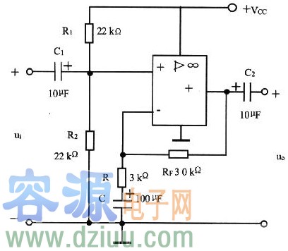 電源Vcc通過R1和R2分壓,使運放同相輸入端電位由于C隔直流,使RF引入直流全負反饋。所以,靜態時運放輸出端的電壓V0=V-≈V+=+Vcc/2;C通交流,使RF引入交流部分負反饋,是電壓串聯負反饋
