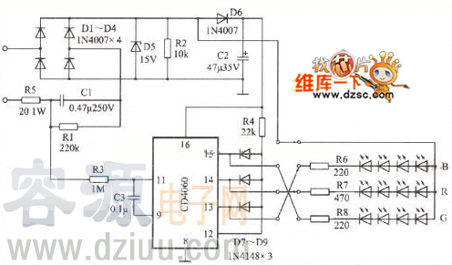 本電路應用CD4060作為制作芯片,電路元器件小,制作方便,可以很方便控制LDE燈的顏色,CD4060的用法電路見下圖;