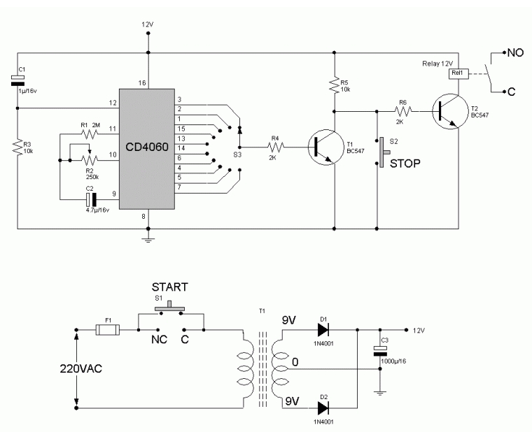 這是CMOS CD4060的電子計時器,它是CMOS 14級紋波傳送二進制計數器/分頻器和振蕩器。