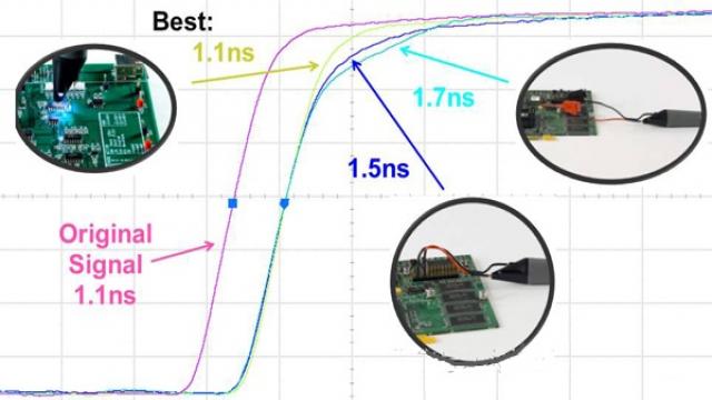 下圖是使用這幾種不同的連接方式對同一個1ns的上升時間信號的測量結果,可以看到,用的連接方式越短,系統的帶寬越高,測得的上升沿越陡。