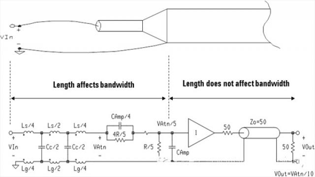 下圖是典型的有源探頭的前端部分的等效電路圖。放大器前面的連接部分是一段阻抗不受控的連接線,有很多的等效電容和等效電感,這部分對系統帶寬、高頻下的輸入阻抗、頻響特性影響很大;放大器后面通常都是50Ω的傳輸線,這部分是阻抗受控的,對于系統帶寬的影響較小。