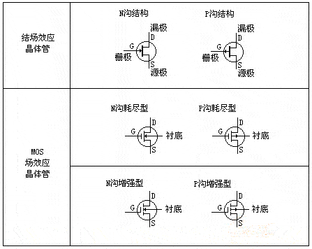 場效應晶體管可分為結場效應晶體管和MOS場效應晶體管。而MOS場效應晶體管又分為N溝耗盡型和增強型;P溝