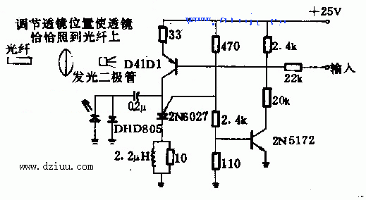 本電路使用中心頻率為50kHz的脈沖速率調制系統。饋給發射機的音頻改變著脈沖速率,用以驅動耦合到光纖的發光二極管(LED)。LED采用通用電氣公司的LED55C或類似的LED。位于光纖另一端的光敏晶體管接收并且解調光信號,使音頻信號復原。 本文由www.gsdpw.cn整理提供,部分內容來源于網絡,如有侵犯到你的權利請與我們聯系更正。