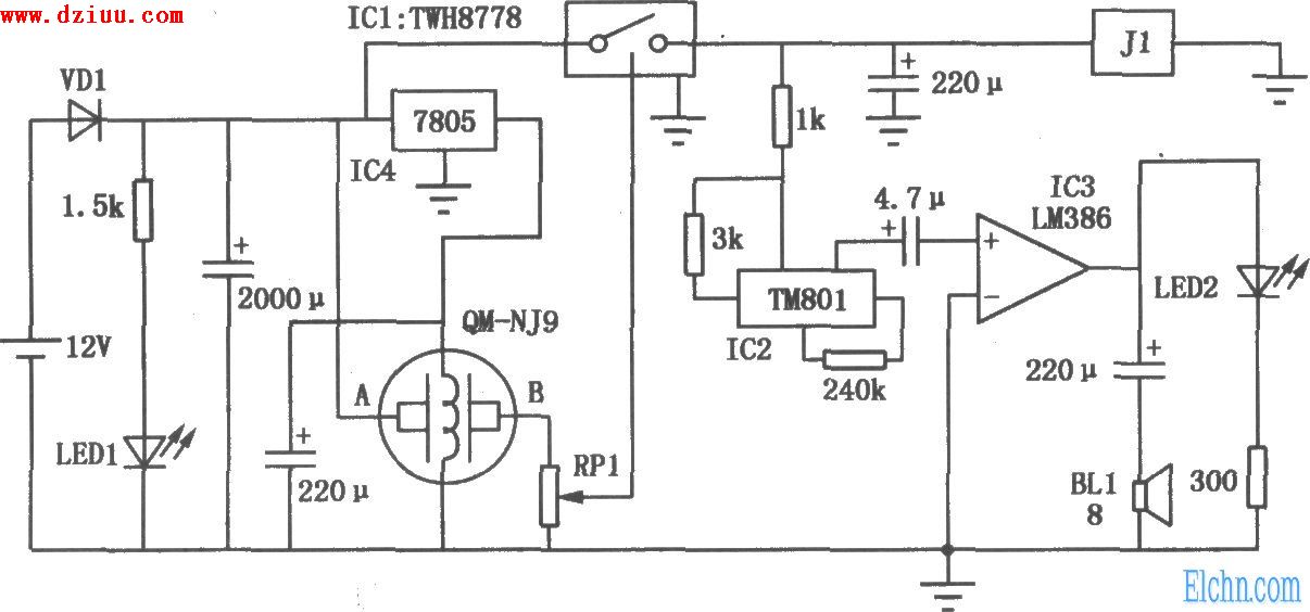 當該電位升高到l.6V時,ICl大功率開關(guān)器件TWH8778接通,使IC2語音集成電路TM801工作,其輸出經(jīng)IC3集成功放LM386進行功率放大后推動揚聲器BLl發(fā)出報警聲。本文由www.gsdpw.cn整理提供,部分內(nèi)容來源于網(wǎng)絡(luò),如有侵犯到你的權(quán)利請與我們聯(lián)系更正。