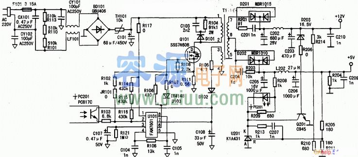 該機穩(wěn)壓控制電路主要由U101、光電耦合器PC201、精密穩(wěn)壓器件U201(KIA431)及取樣電阻R205、R211、R214、R210等組成。當開關(guān)變壓器次級+12V或+5V輸出電壓升高時,經(jīng)取樣電阻分壓加至U201之R端電位升高,L5201之K端電壓則降低,使流經(jīng)光電耦合器PC201內(nèi)部光敏二極管之電流增大,其發(fā)光管亮度增強,光敏三極管導通程度增強,最終使流入U101之②腳電流