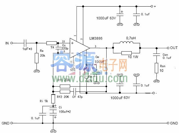LM3886功率放大電路圖 <<版權聲明:本文由容源電子網(www_dziuu_com)整理提供,部分內容來源于網絡,如有侵犯到你的權利請與我們聯系更正。》