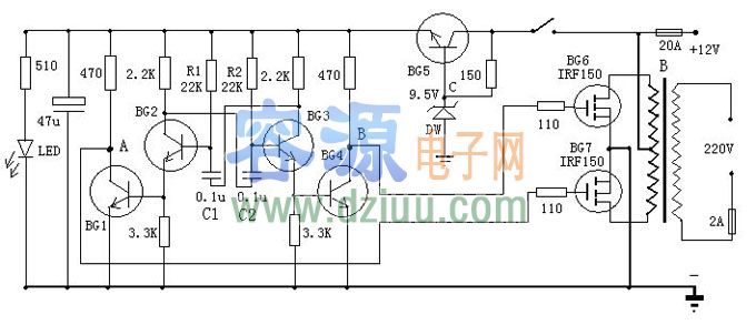 制作的逆變器,可以將12V電源電壓變為220V市電,電路由BG2和BG3組成的多諧振蕩器推動,再通過BG1和BG2驅動,來控制BG6和BG7工作。 <<版權聲明:本文由容源電子網(www_dziuu_com)整理提供,部分內容來源于網絡,如有侵犯到你的權利請與我們聯系更正。》