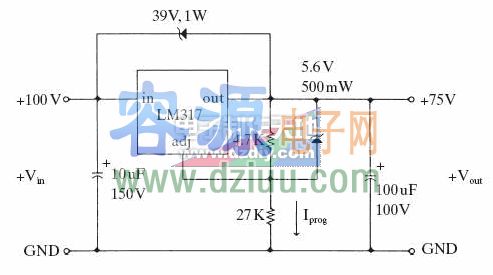 電路,輸入是100V,輸出是75V,LM317居然可以承受這么高電壓,最關(guān)鍵是圖中39V的穩(wěn)壓管,