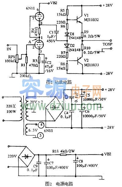 圖1是筆者最近采用國產膽管6N11設計的一款膽石混合式功放,對于廣大“膽”機愛好者也許會起到拋磚引玉的作用。圖2為電源電路。 <<版權聲明:本文由容源電子網(www_dziuu_com)整理提供,部分內容來源于網絡,如有侵犯到你的權利請與我們聯系更正。》