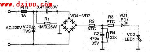 LED驅(qū)動(dòng)電源要有抑制浪涌的侵入、保護(hù)LED不被損壞的能力。本電路用負(fù)溫度系數(shù)熱敏電阻來限制電流的突變,容-源-電-子-網(wǎng)-為你提供技術(shù)支持