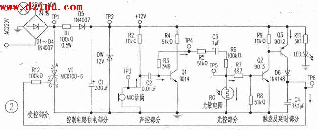 而在白天,光線強時,無論環境中有沒有聲音,都不會啟動開關,燈泡自然也不會亮,達到節能的目的.下載為大家提供聲光控制開關電路圖本文由www.gsdpw.cn整理提供,部分內容來源于網絡,如有侵犯到你的權利請與我們聯系更正。