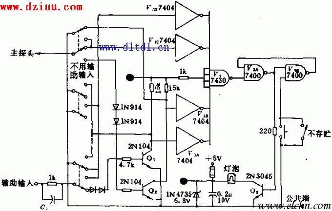 本電路可檢測二進制電平和脈沖的重合性。由開關晶體管Q3進行驅動的指示燈很亮。當把