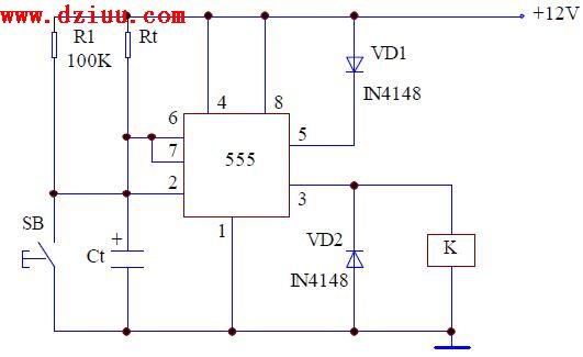 當(dāng)按下按鈕SB 時(shí),12V 的電源通過電阻器Rt 向電容器Ct 充電,使得6 腳的電位不斷升高,當(dāng)6 腳的電位升到5 腳的電位時(shí),電路復(fù)位定時(shí)結(jié)束。