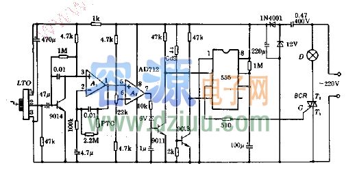 555構成單穩電路,D是受控照明燈。BCR是雙向晶閘管,受555輸出控制。《版權聲明:本文由www.gsdpw.cn整理提供,部分內容來源于網絡,如有侵犯到你的權利請與我們聯系更正。》