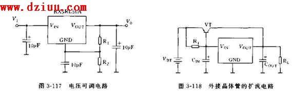 圖3-118是外接晶體管的擴流電路,外接PNP晶體管VT和片內P溝道晶體管構成達克林頓管。輸出電流較大時,輸入輸出電壓差