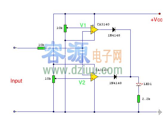 輸入電壓大于V1的設(shè)置的限制,那么CA3140將其輸出擺動幾乎在整個電源電壓和燈的LED。同樣,