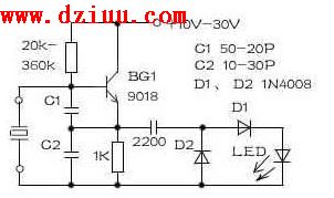 制作中應(yīng)注意:晶振的兩條引出線不能相距過近,否則振蕩幅度大大減小導(dǎo)致發(fā)光管不亮。