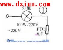 準(zhǔn)備一支100W的白熾燈和帶電源插頭導(dǎo)線一根。燈泡、PTC元件串聯(lián)接成如圖1