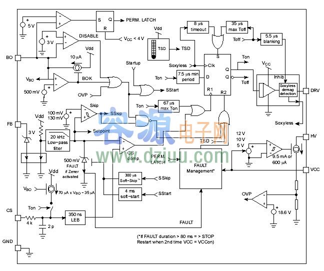 下面在為大家提供NCP1337P內(nèi)部電路圖   <<版權(quán)聲明:本文由容源電子網(wǎng)(www.gsdpw.cn)整理提供,部分內(nèi)容來源于網(wǎng)絡(luò),如有侵犯到你的權(quán)利請與我們聯(lián)系更正!