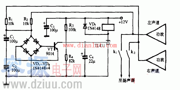 音源輸入電路和喇叭保護電路,其原理簡介如下: CD4017以及其外圍電路組成音源切換電路,開關K是轉換按鈕,每按一下CD4017相應的某個腳將輸出高電平,使與這個腳連接的三極管導通,連接在該三極管的繼電器獲