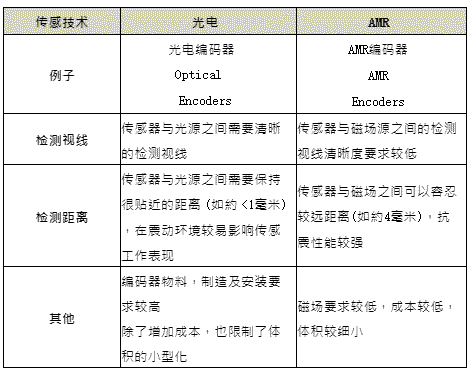 與傳統光學傳感技術比較,AMR技術可提供較小巧的外觀、低成本,并且更適合在惡劣環境下工作,例如骯臟及溫度變化的工作環境中。表1列舉了兩者之間的比較,從中可以明顯看出在無刷直流電機中使用AMR的優點。