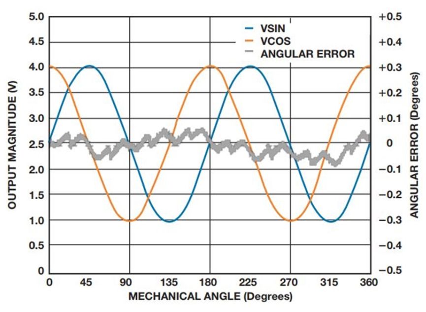 圖2,在360°機械旋轉下的ADA4571誤差(灰色)和輸出波形(橙色/藍色)