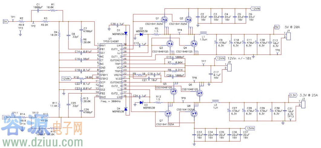 PMP3199 是用于銀盒電源的雙輸出同步降壓設計。銀盒電源用在臺式機中。其輸入電壓為 12V.采用 TPS5124 產生 5V (20A) 和 3.3V (25A) 輸出。該設計具有出色的效率(高達 92%)。主電