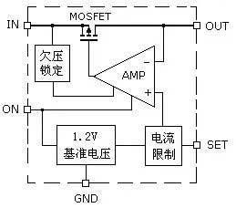 AAT4610將6V/2A的P溝道MOSFET場(chǎng)效應(yīng)管與柵極驅(qū)動(dòng)器、電壓基準(zhǔn)、限流比較器和欠壓閉鎖電路組合在SOT-23-5封裝中(如圖2)。其中MOSFET是一個(gè)電子開關(guān),它的通斷受比較器輸出電壓的控制,如果輸出電流大于設(shè)定電流,運(yùn)算放大器AMP輸出負(fù)電壓,關(guān)斷MOSFET,停止電壓輸出,對(duì)供電電路起到保護(hù)作用。MOSFET的溝道電阻最大值僅為180mΩ,關(guān)斷模式下靜態(tài)電流為1mA。MOSFET的工作電壓為2.7V~5.5V,輸入電壓低于2.7V時(shí),由欠壓鎖定電路關(guān)斷MOSFET,對(duì)供電電路進(jìn)行欠壓保護(hù)。