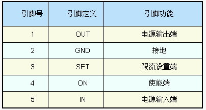 我們?nèi)砸訟AT4610為例,說明電子開關(guān)實(shí)現(xiàn)過流保護(hù)的工作原理。AAT4610采用SOT-23塑料封裝(如圖1),5個(gè)引腳的定義見表1。
