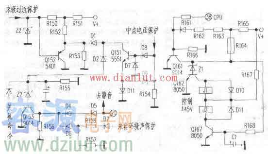該電路以Q4、Q5為中心,組成了直流電壓取樣檢測(cè)電路。圖中的Q1、Q2等系右聲道功率輸出電路(左聲道功率輸出電路圖中未畫出)。右聲道的直流電壓取樣信號(hào)經(jīng)由R6(左聲道取樣信號(hào)經(jīng)由R21)衰減、隔離,C2、C3濾波