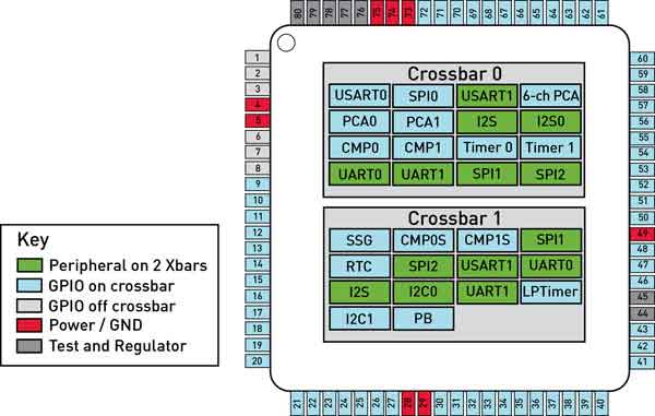 圖1:Silicon Labs新推出的Precision32系列專利Crossbar技術(shù)幾乎可以讓任何外設(shè)使用任何引腳。