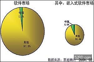 嵌入式軟件產業發展迅猛,已成為軟件體系的重要組成部分。嵌入式系統產品正不斷滲透各個行業,嵌入式軟件作為包含在這些硬件產品中的特殊軟件形態,其產業增幅不斷加大,而且在整個軟件產業的比重日趨提高。2003年全球嵌入式軟件市場規模達到346億美元, 2003年中國市場規模達到188億元,預計到2006年嵌入式軟件市場規模將突破400億元大關,2003-2006年均復合增長率將達到30%。