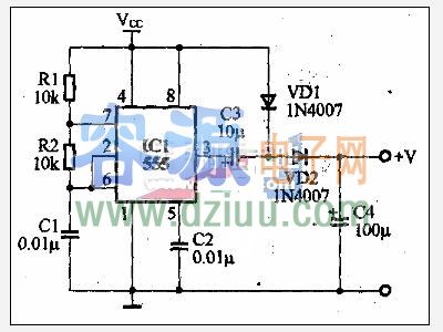 555集成電路和R1,R2、C1組成無穩態多諧振蕩器,按圖中阻、容參數,振蕩頻率約在5kHz左右,經VD1、VD2整流、倍壓輸出。假如輸入電壓VCC=12V,則輸出電壓約在20V~24V,根據負載大小而有所變化。 <<版權聲明:本文由容源電子網(www_dziuu_com)整理提供,部分內容來源于網絡,如有侵犯到你的權利請與我們聯系更正。》