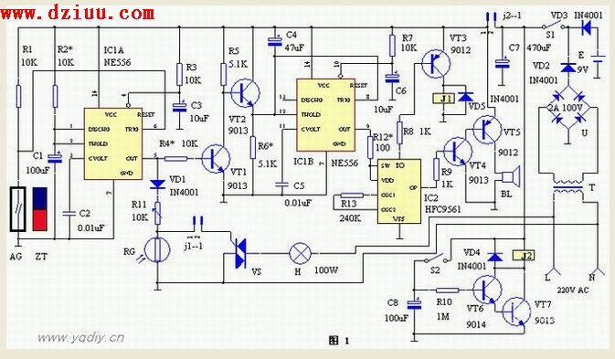 IC2的T0端不斷有脈沖電流產(chǎn)生,經(jīng)三極管VT3放大后,推動(dòng)繼電器J1的觸點(diǎn)j1-1動(dòng)合開,這樣就使原來恒亮的照明燈變成了閃爍燈,以增強(qiáng)報(bào)警時(shí)的緊張氣氛,同是地IC2的O/P端輸出報(bào)警音頻信號(hào),經(jīng)VT4、VT5放大后,推動(dòng)揚(yáng)聲器BL發(fā)出宏亮的聲音。