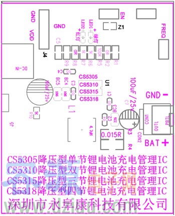 深圳市永阜康科技有限公司結(jié)合客戶實際應(yīng)用方案,推出管腳兼容的單節(jié)/兩節(jié)/三節(jié)/四節(jié)鋰電池同步降壓型充電管理芯片系列:CS5305/CS5310/CS5315/CS5318,耐壓高達28V。該系列芯片具有頻率抖動的功能,大大改善系統(tǒng)的EMI特性;充電電流最高可達3A,效率90%以上;全系列型號都具備完整的涓流,恒流,恒壓充電過程;具有終止電流可編程功能,通過設(shè)置不同的外部分壓電阻, 可以很方便的調(diào)節(jié)充電終止電流的大;各種安全可靠的保護措施以及雙LED燈充電狀態(tài)指示,還帶了NTC溫度控制功能;全系列芯片采用獨有的EQA-16封裝,尺寸與SOP-8大小相當。廣泛應(yīng)用于按摩儀、榨汁機、藍牙音響、廣場舞音響、無人機等案列。