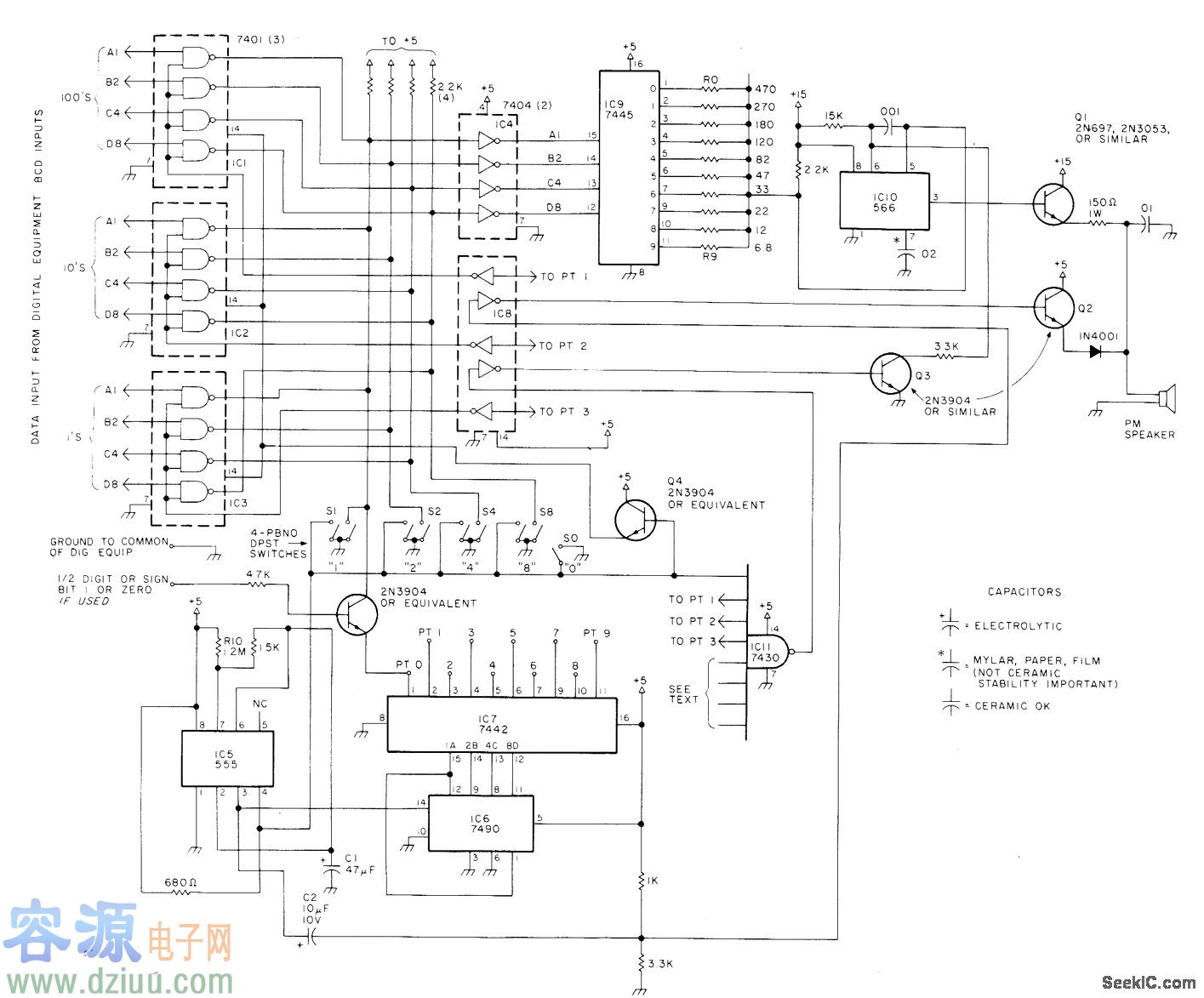 該電路將數字測試轉換為BCD輸入以適應0到9以串聯(lián)10個不同的音調序列,目的在于幫助盲人無線電操作者或實驗者識別數字顯示器顯示的讀數。音調序列的長度等于顯示的位數加上所需的標記指示或半數字。 :