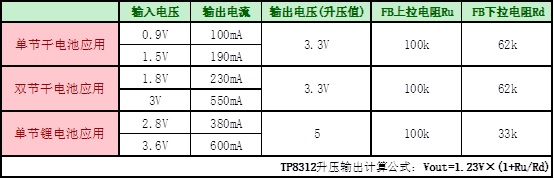 TP8312應用于單節(jié)干電池1.5V、雙節(jié)干電池3V、單節(jié)鋰電池3.7V升壓典型參數(shù)如下:
