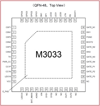 M3033 是一款電源管理 SOC,集成了單指令周期的高性能微處理器(MCU)、16-bit 高精度模/數轉換單元(SD-ADC)、Buck-Boost 控制單元、MOSFET 驅動接口、LED 直接驅動接口,以及多種安全保護機制。M3033支持 PD2.0、QC2.0 快充協議,配合少許外圍電路,即可組成 2-7 串電池的充電管理解決方案。采用QFN-48封裝。