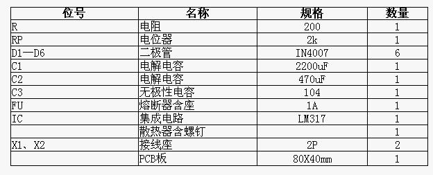 下面是LM317可調(diào)穩(wěn)壓電源電路圖的元器件清單:
