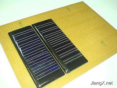 準備一塊萬用電路板。圖2是準備好的兩塊太陽能電池板和洞洞板。電池選用一顆額定電壓為1.2V的普通5號鎳氫充電電池
