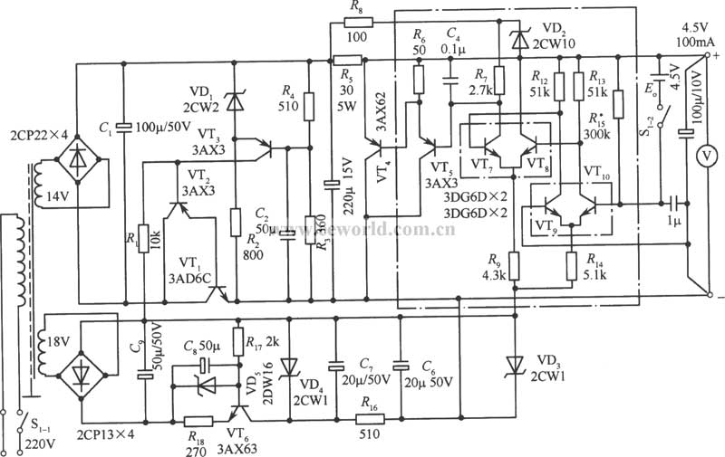后,得到4.5V 100mA的輸出電壓。電路元器件的參數(shù)在電路中,本電路最大的特點(diǎn)