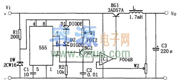 為用555構(gòu)成的升壓型開關(guān)穩(wěn)壓電源電路。電路中,采用晶體管BG1