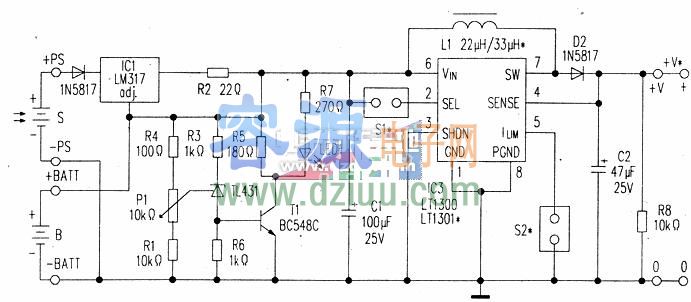 采用鎳氫充電電池。IC3用LT1300時應使用兩個1.2V的電池。用LT1301時應使用三個電池。太陽能電池S輸出電壓9V、輸出電流100mA.扼流圈L1應在800mA時不會飽和,其值在附表中已經標明,D1和D2為肖特基快恢復二極管。 <<版權聲明:本文由容源電子網(www_dziuu_com)整理提供,部分內容來源于網絡,如有侵犯到你的權利請與我們聯系更正。》