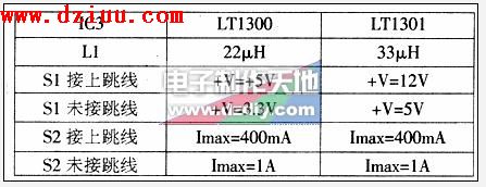 ,當S1接上跳線時可獲得+5V(LT1300)或+12V(LT1301)的直流電壓輸出。當S1未接跳線時可獲得+3.3V(LT1300)或+5V(LT1301)的輸出,同樣S2接上跳線或未接跳線可得到400mA或1A的輸出電流。