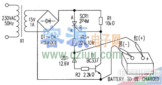 這是一種簡單、自動化的電池充電器,它由可控硅2P4M(SCR1)、晶體管BC337(T1)、齊納二極管ZD1和少量分立元件組成。 <<版權聲明:本文由容源電子網(www_dziuu_com)整理提供,部分內容來源于網絡,如有侵犯到你的權利請與我們聯系更正!