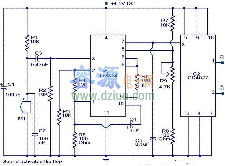 LM324和CD4027構(gòu)成的聲音操作觸發(fā)器電路 <<版權(quán)聲明:本文由容源電子網(wǎng)(www_dziuu_com)整理提供,部分內(nèi)容來源于網(wǎng)絡(luò),如有侵犯到你的權(quán)利請與我們聯(lián)系更正。》