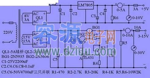 你想把可調(diào)電壓范圍擴(kuò)大,可以改變 R4和 R3的電阻值,當(dāng)然變壓器的次級(jí)電壓也要提高。變壓器的功率可根據(jù)輸出電流靈活掌握,次級(jí)電壓 15V左右。橋式整流用的整流管 QL用 15- 20A硅橋,結(jié)構(gòu)緊湊,