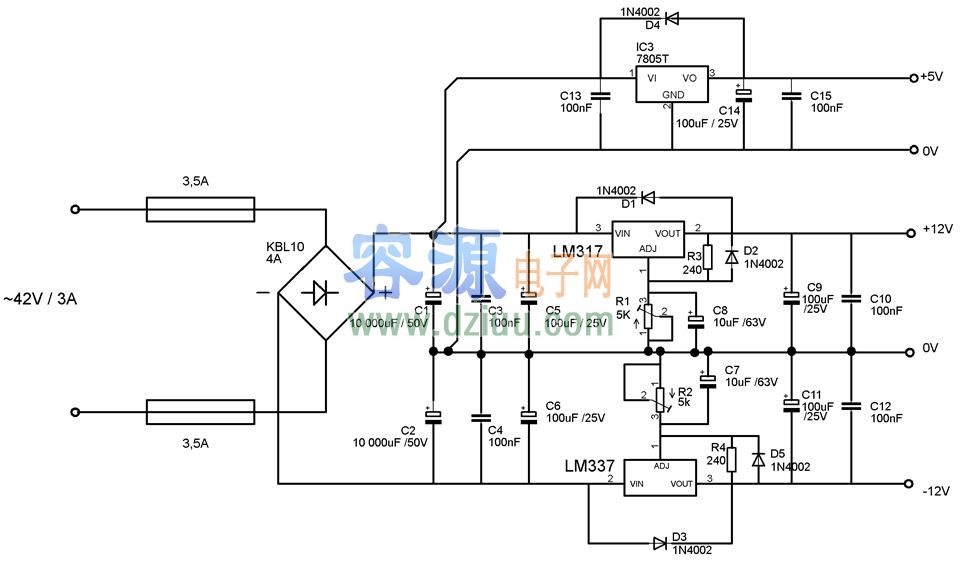 L7805CV、LM317、LM337三端集成穩壓應用電路圖