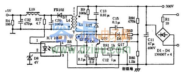 脈寬調(diào)制開關(guān)電源。Q16為開關(guān)管,R84為起動電阻,R83、C15為正反饋RC元件。D5為C15的放電通路。Q17為脈沖控制管,其基極R82的電壓降組成開關(guān)管Q16的過流保護電路,R81、C12